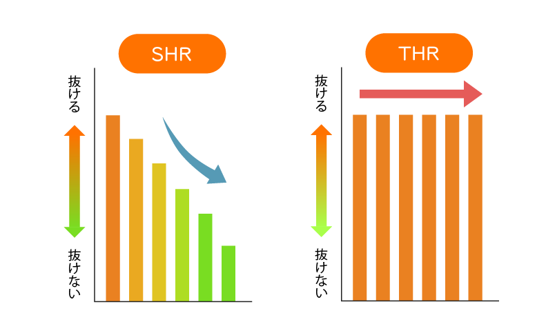 SHR:照射パワーが優しく、じっくり温めながら毛根にダメージを与えていくため日焼けした肌にも対応でき、産毛にもアプローチ可能です。